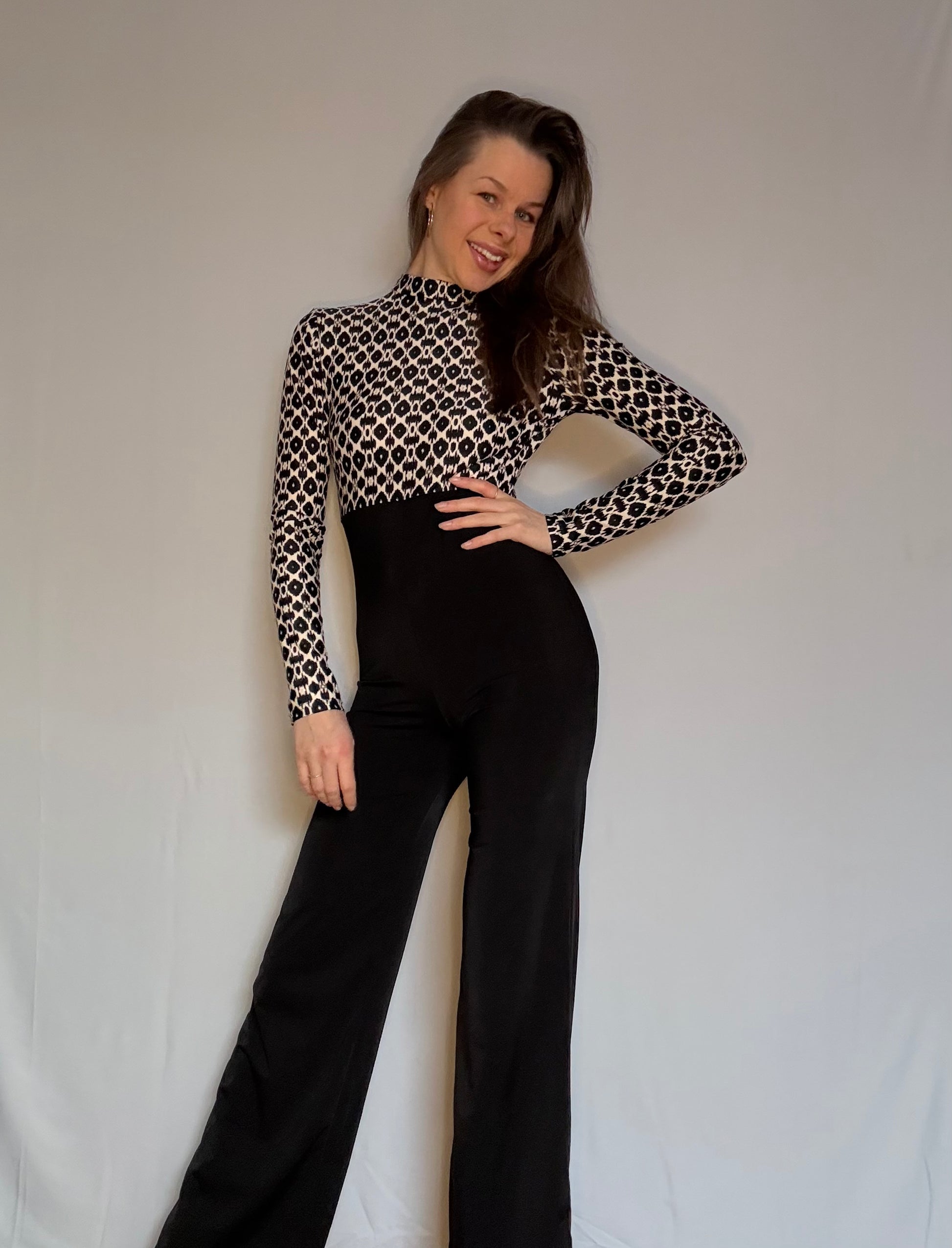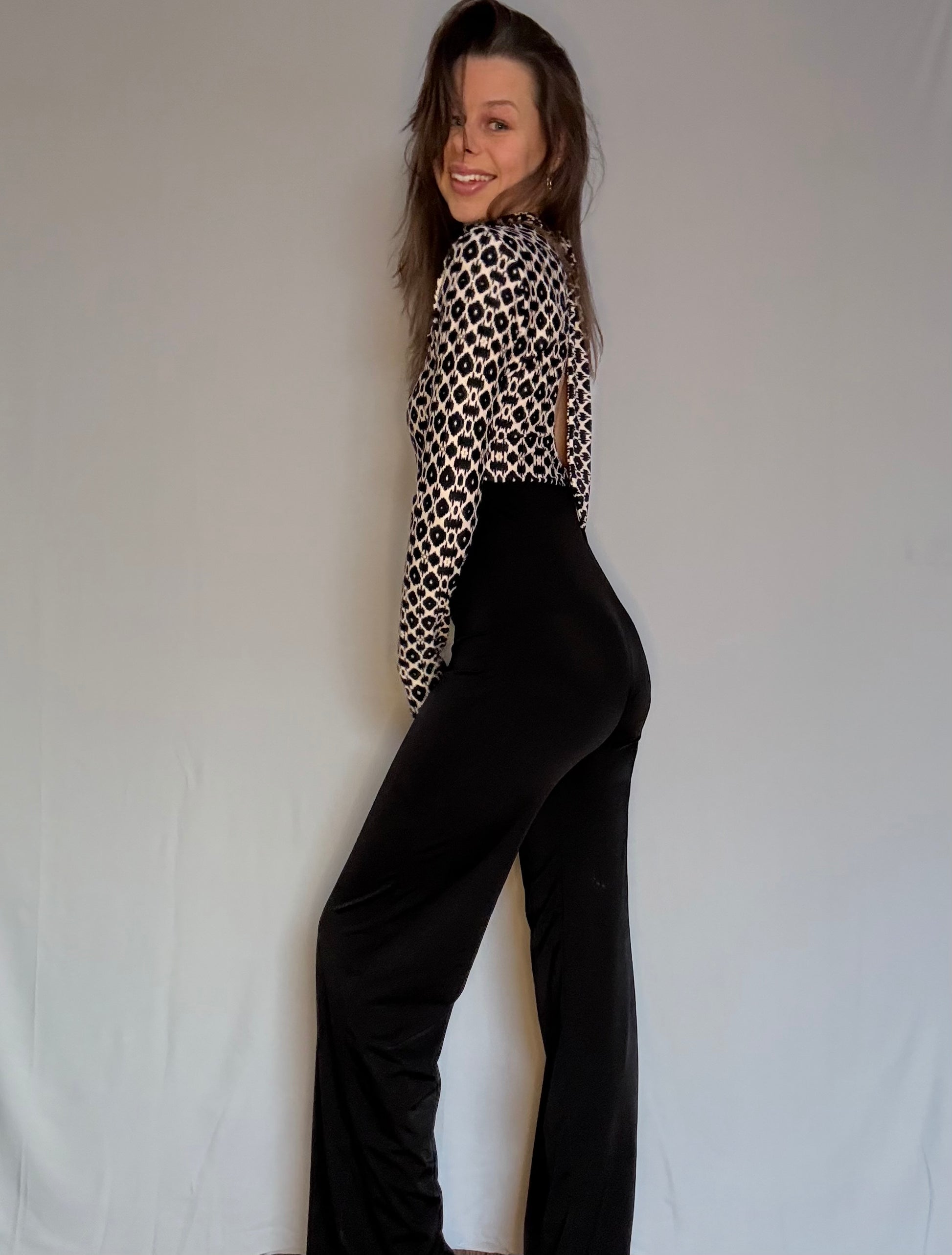 A longsleeve jumpsuit with turtleneck and straight legs. The jumpsuit is open at the back and you can close it with a bow at the neck. Super comfortabel and soft material.